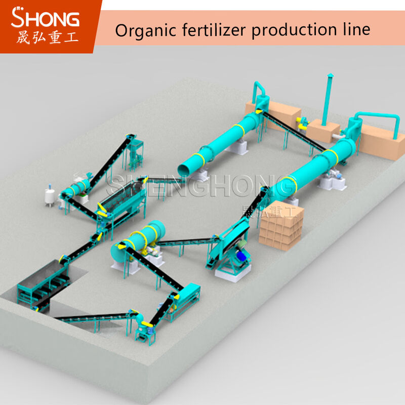 Оборудование для производства гранулированных органических удобрений: ворошитель компоста --- вертикальная дробилка --- барабанный грохот (опционально) --- дозатор и горизонтальный смеситель (используются вместе, относится к дополнительному оборудованию) --- дисковый гранулятор --- сушилка и охладитель --- барабанный грохот --- округлитель (опционально) --- машина для нанесения покрытия (опционально) --- однобункерная упаковочная машина.